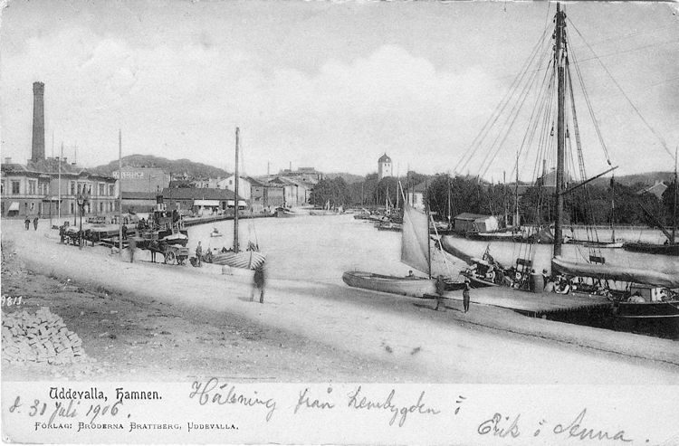 Tryckt text på vykortets framsida: "Uddevalla, Hamnen."
