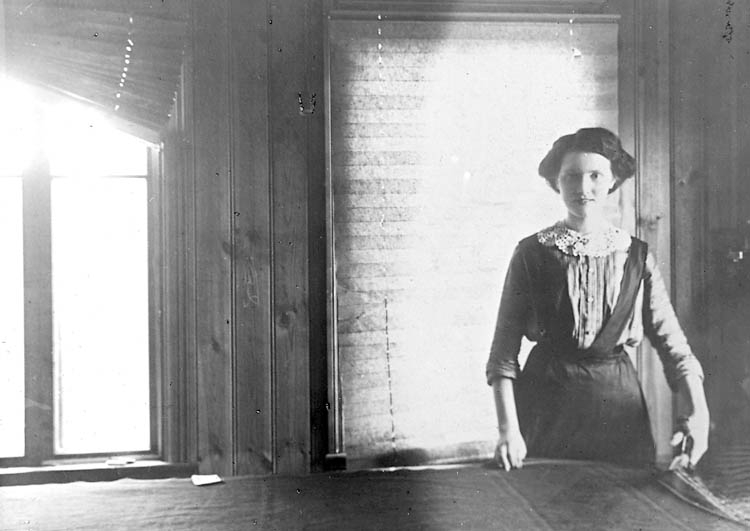Tillskärerska vid ett tillskärningsbord i konfektionsfabriken