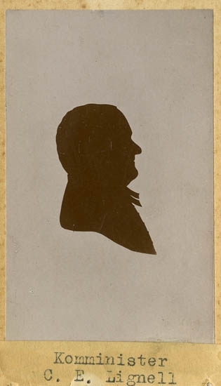 Text på kortets baksida: "Commenister Carl Erik Lignell, f. 1796 i Halmstad. Collega son. Till Lund 1813. Upsala 1815. Collega i u-a 1821. Prestervigd 1822, v. rector 1826. Comm. Kurhusprest i U-a. Pastor i Svenljunga 1840. G. m. Johanna Marg. L. kusin 1804. Barn Johan, Carl, Hilmer, Axel, Casten, Birger. C.E. L.död 1855".