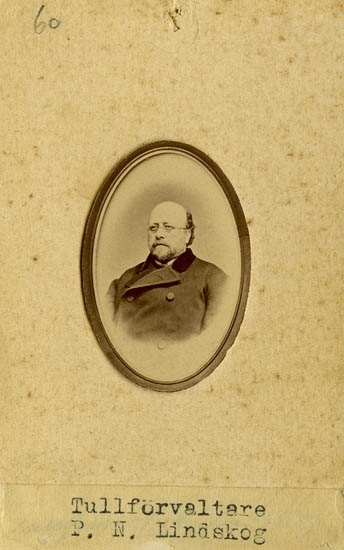 Text på kortets baksida: "Tullförvaltaren P. N. Lindskog. Utnämd Juli 1869 t. Tullf. i U-a, förut 1/2 år t.f. Tullf. här och tidigare Öfverupps. man vid Sjötullkammaren i i Strömstad".