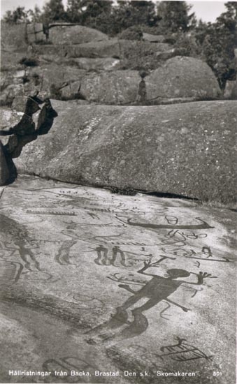 Tryckt text på kortet: "Hällristningar från Backa, Brastad. Den s.k. "Skomakaren".