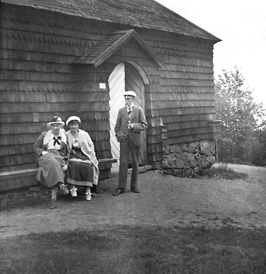 Enligt noteringar: "Kand. Arne Annell, Elsa och ego utanför Bäckaby kyrka, Jönköping 1918."