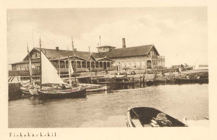 "Fiskebäckskils Havskuranstalt. Västkustens mest besökta badort. Säsong från 10 Juni - 31 augusti. Förstklassig restaurant. Inackordering: hel dag kr. 5:25. Lunch och middag kr. 4:50. Rum á kr. 1:50 - 3:- pr. dag. Rumsbeställning genom kamrerarkontoret."