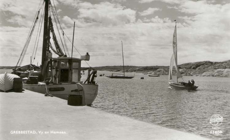 Tryckt text på kortet: "Grebbestad. Vy av Hamnen."