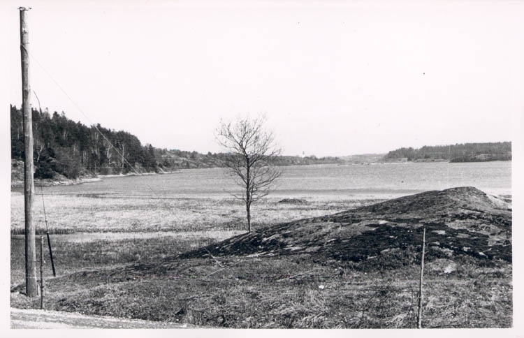 "Myckleby kyrka sedd från vägen Groröd- Vräland över Grindsbyvattnet."
