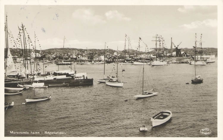 Tryckt text på kortet: "Marstrands hamn i Regattatider."