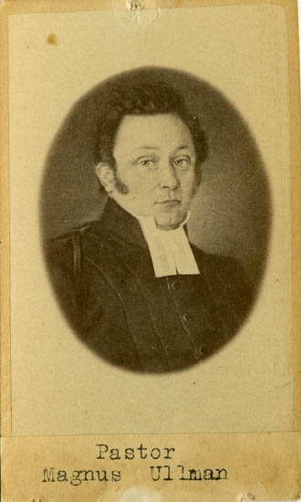 Text på kortets baksida: "Magnus Ullman d. ä. Född 1798 13/2 son af pastor i Onsala mf. samma namn. Till Lund 1814, magister der 1823. Prestvigd 1824. Adjunkt i Christiania f. 1826 adjunkt Gustavi f. 1827. Samma år Katechet. Kyrkoherde i U-a 28/8 1838. Titulärprost jan 1842.Död 21 mars 1842. G. m. Magdalena Hegardt. Barn Magnus, pastori Warberg. Chr.Gid. landtbrukare. Uddo lektor. Carl Anders Göteborg. Tre döttrar".