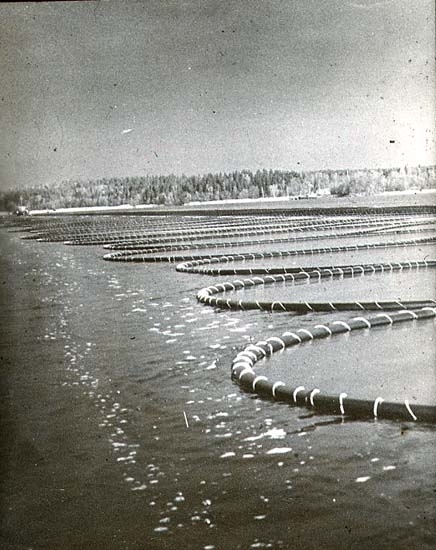 Svart-vitt foto. Oljelänsor av plast.
