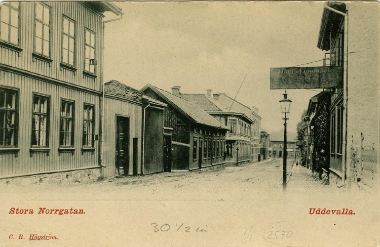 Tryckt text på vykortets framsida: "Stora Norrgatan. Uddevalla."