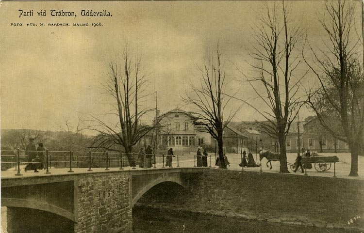 Tryckt text på vykortets framsida: "Parti vid träbron Uddevalla."