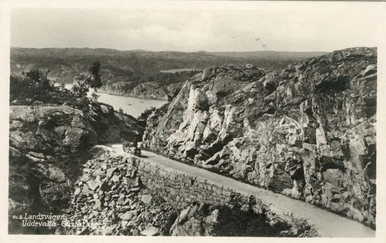 Tryckt text på vykortets framsida: "Landsvägen Uddevalla - Gustafsberg."