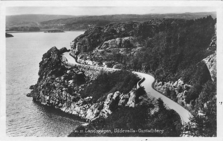 Tryckt text på vykortets framsida: "Landsvägen, Uddevalla - Gustafsberg."