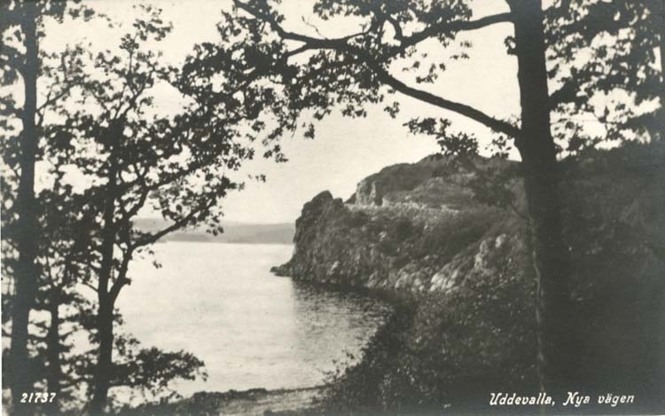 Tryckt text på vykortets framsida: "Uddevalla, Nya vägen."