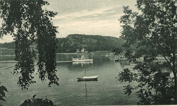 Tryckt text på vykortets framsida: "Vy av Byfjorden vid Gustafsberg."