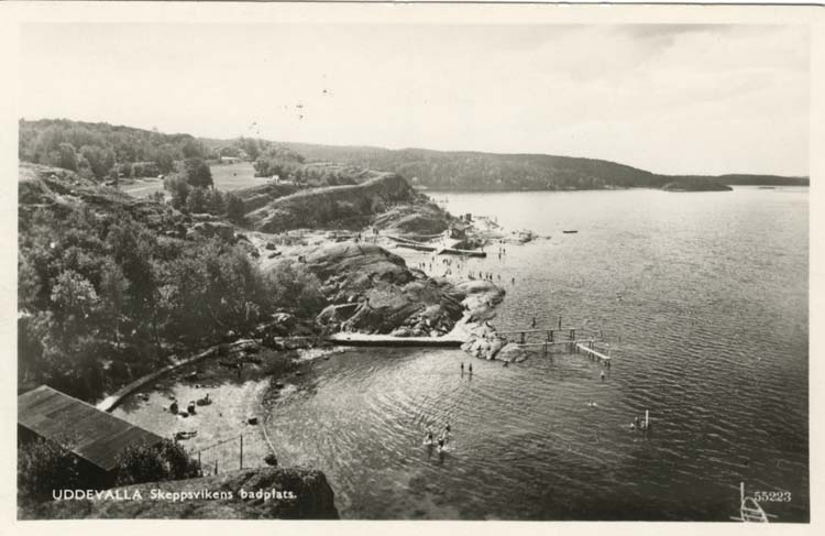 Tryckt text på vykortets framsida: "Uddevalla, Skeppsvikens badplats."
