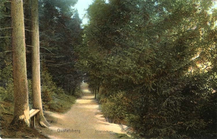 Tryckt text på vykortets framsida: "Gustafsberg Strandvägen."