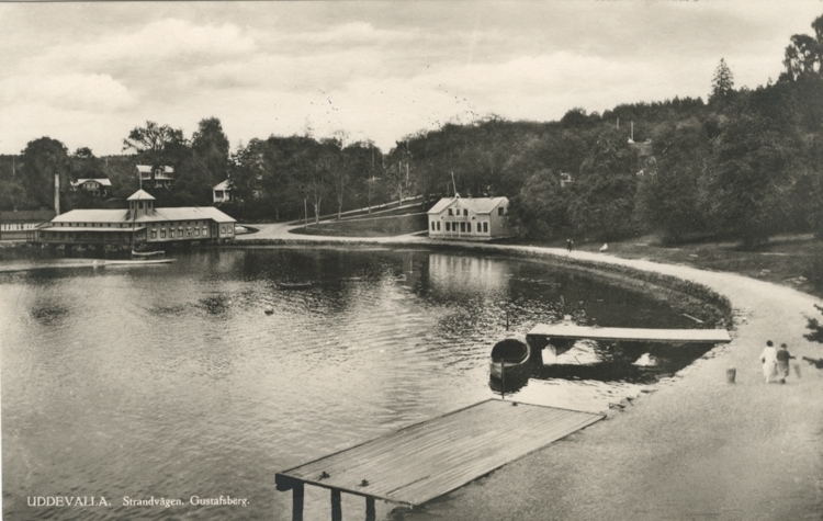 Tryckt text på vykortets framsida: "UDDEVALLA Strandvägen Gustafsberg."