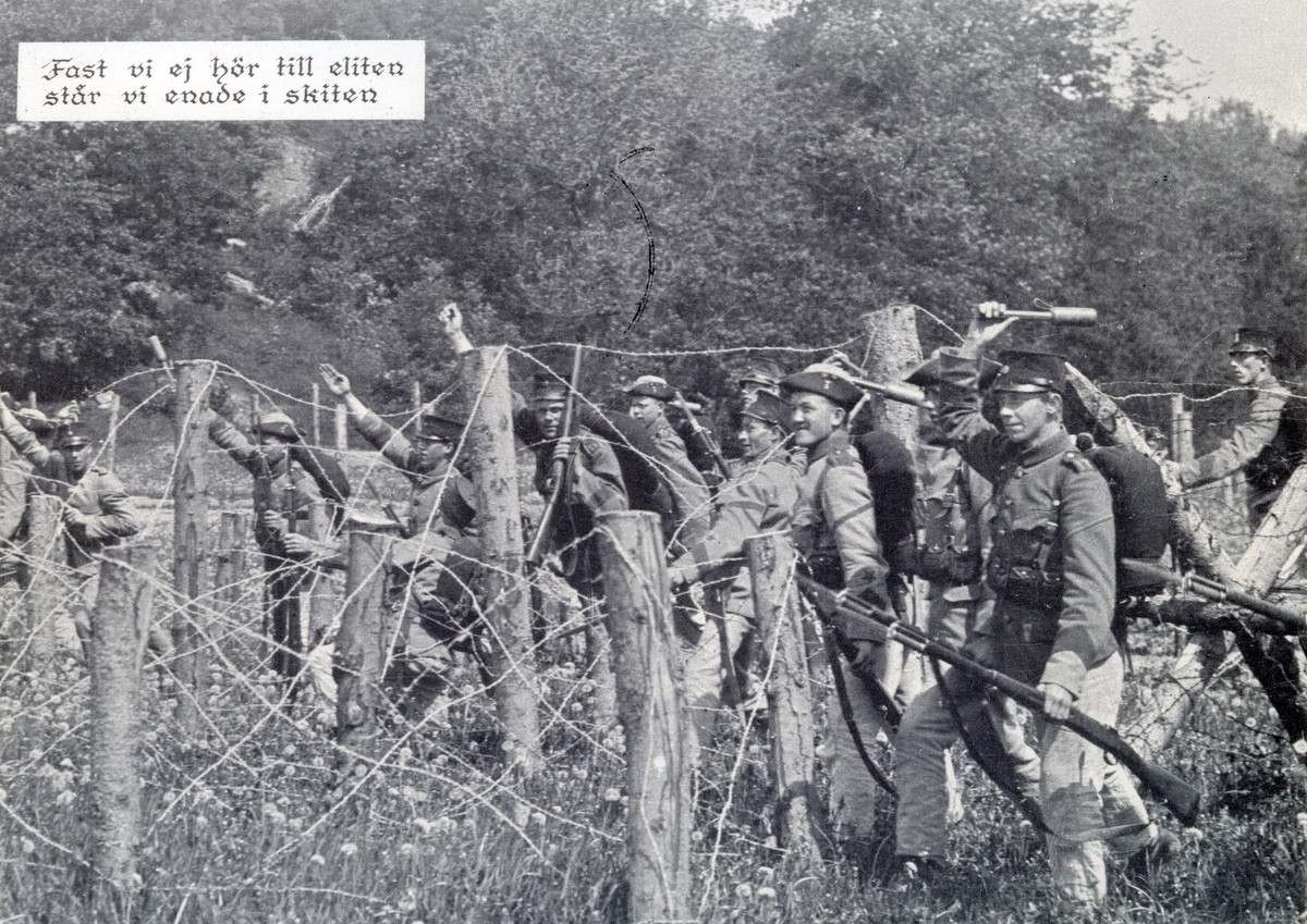 Tryckt text på vykortets framsida: "Fast vi ej hör till eliten står vi enade i skiten."