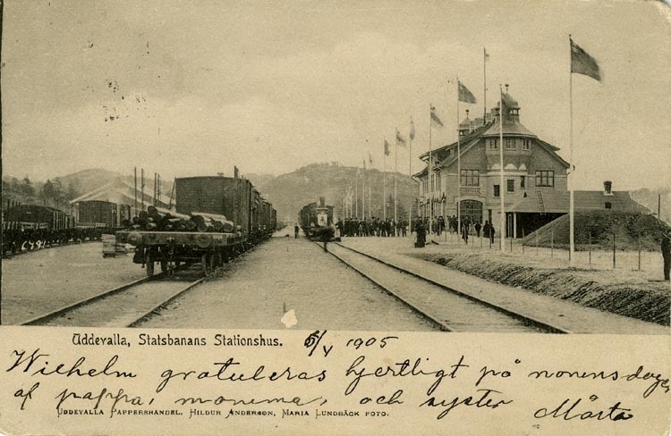 Tryckt text på vykortets framsida: "Uddevalla, Statsbanans Stationshus."