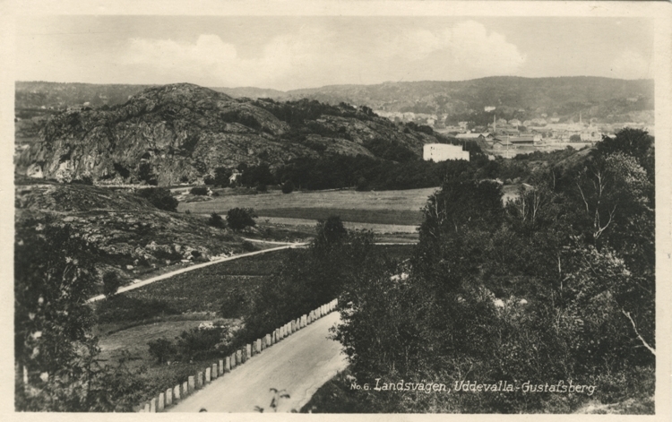 Tryckt text på vykortets framsida: "Landsvägen, Uddevalla - Gustafsberg."