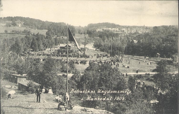 Tryckt text på kortet: "Bohusläns Ungdomsmöte i Munkedal 1908".