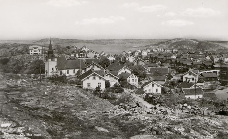 UTSIKT N.O. FR. HERMANÖ. G. ÄR ENL. HOLMBERG BOHUSLÄNS ÄLDSTA FISKELÄGE, ANLAGET PÅ 1200-T. HAKON HAKONSSON. (SE DENNES SAGA). ENL. CLAES KRANTZ ÄR DOCK GULLÖ I DENNA SAGA=GULLÖN I NORDRE ÄLV".