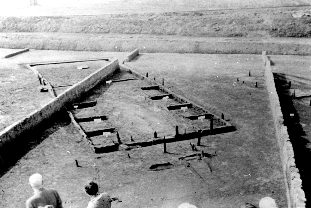 Enligt text: "En av husgrunderna i järnåldersbyn vid Fedderssen Wierde i närheten av Bremerhafen".