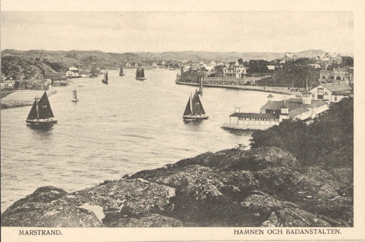 Tryckt text på kortet: "Marstrand. Hamn och Badanstalt."