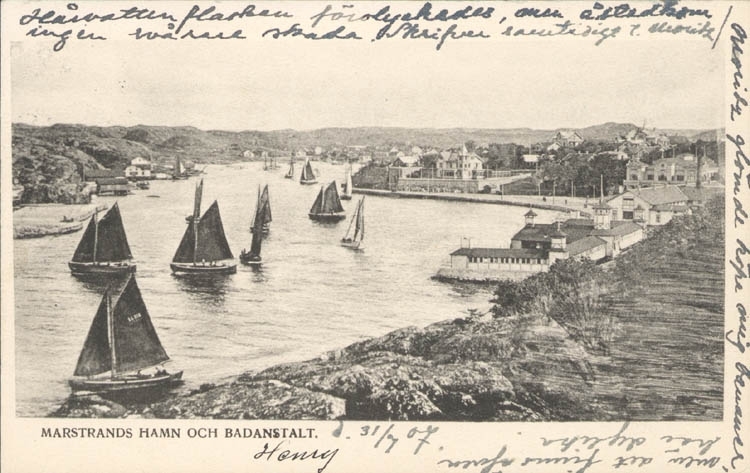 Tryckt text på kortet: "Marstrands Hamn och Badanstalt."