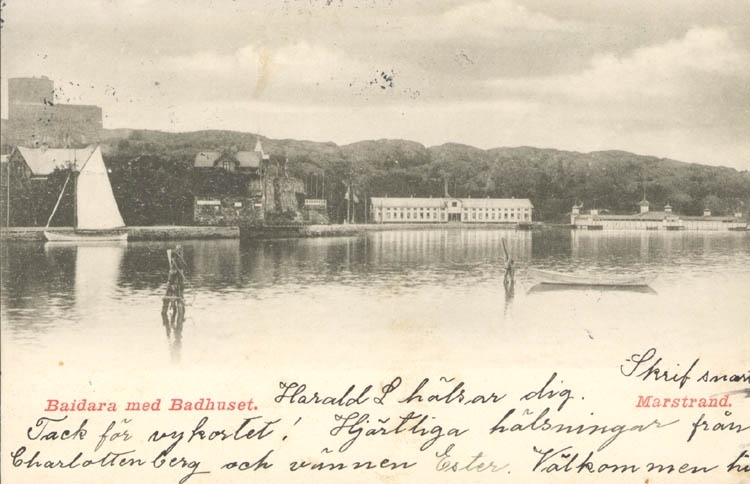 Tryckt text på kortet: "Baidara med Badhuset. Marstrand."