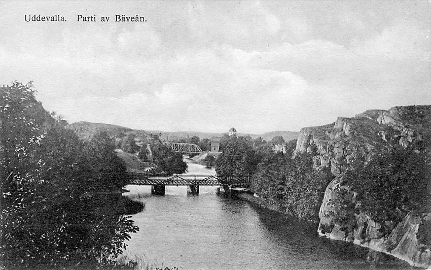 Tryckt text på vykortets framsida: "Uddevalla. Parti av Bäveån".