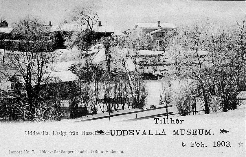 Tryckt text på vykortets framsida: "Uddevalla Utsigt från Hasselbacken".