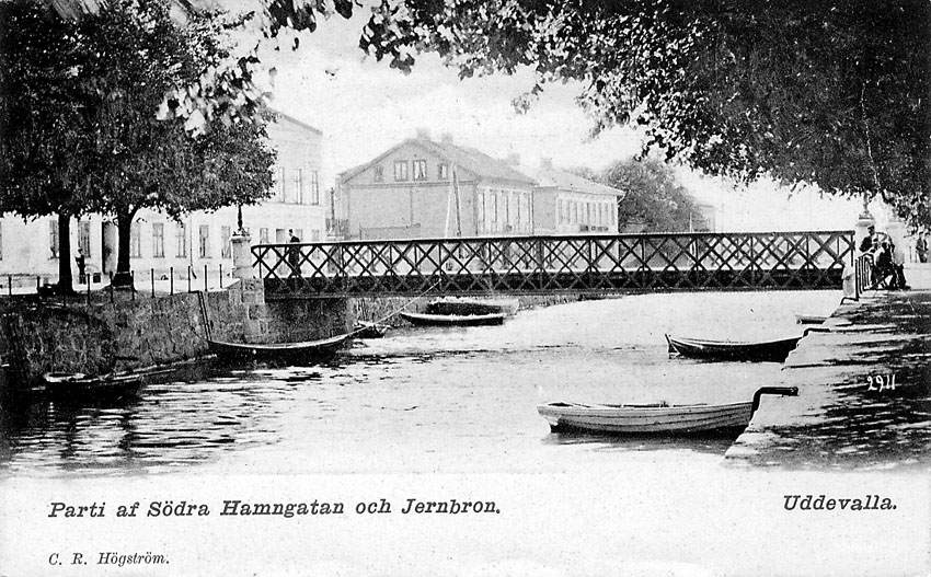 Tryckt text på vykortets framsida: "Parti af Södra Hamngatan och Jernbron".