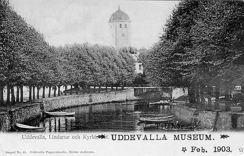 Tryckt text på vykortets framsida: "Uddevalla Lindarne och Kyrktornet".