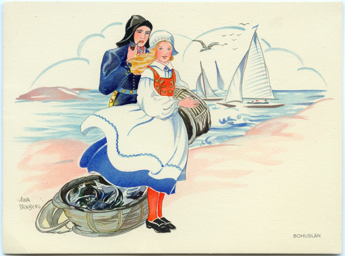 En kvinna i dräkt från Bohuslän står med en korg i famnen och tittar på betraktaren. Kvinnans hår och kjol fladdrar i vinden. Bakom henne står en man iklädd uniformsjacka och sydväst och röker pipa. På marken bredvid dem står en korg med fisk. I bakgrunden syns en skärgård med båtar. Konstnärens signatur är tryckt i nedre vänstra hörnet, i nedre högra hörnet står "Bohuslän".