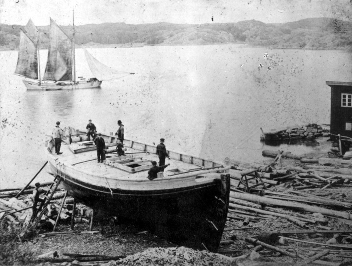 Skrivet på baksidan: Klinkbygge färdigt för sjösättning. Uppköpare båt för sollfraktning. Byggd för Karl Holm, Klädesholmen. omkr. 1905.