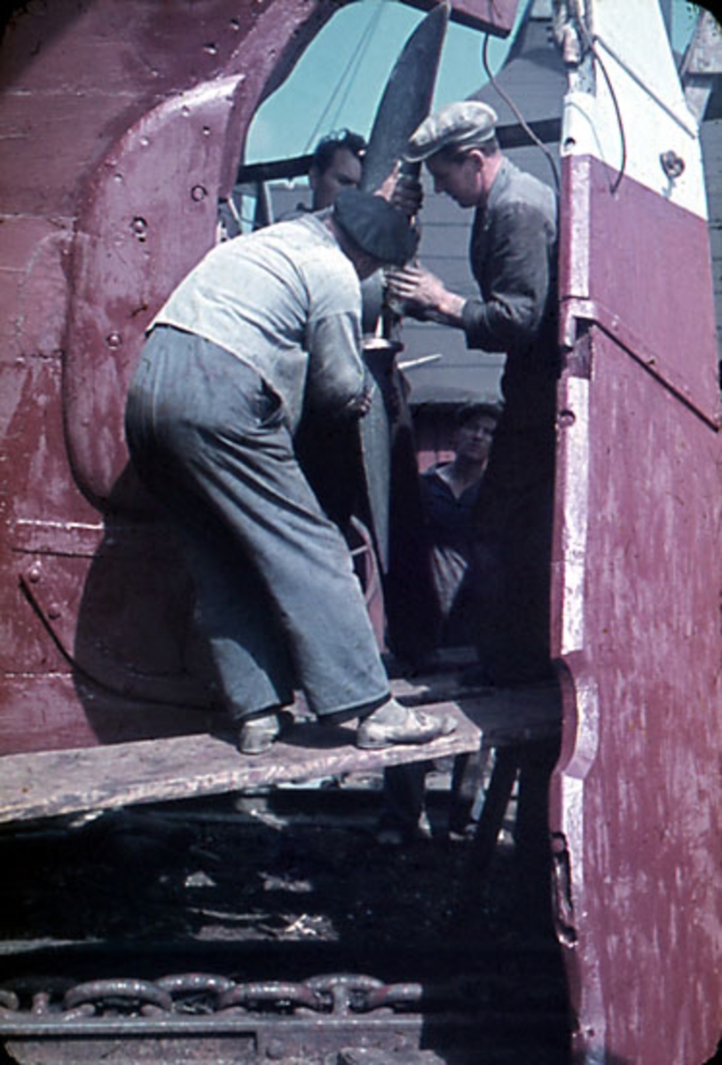Bergs varv på slipen samma båt som 2743c01, 2743c09, 2743b13, 2743b14, mannen t.h. i bilden med vit keps Östen Berg.
