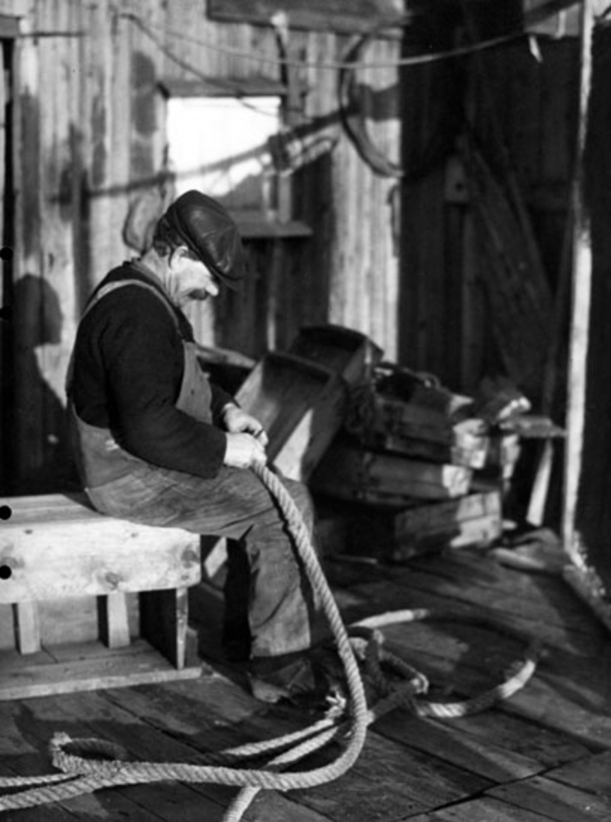 Skrivet på baksidan: På bod plattingen sitter man och lagar tågvirke. Hovenäset