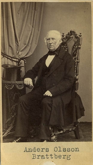Text på kortets baksida: "Anders Olsson Brattberg. Handl. o Barnhusdiriktör Anders Olsson Brattberg f. 22/4 1792 d. 13/10 1876. (84-5-21) Barnhusdir. 1849-1852. Ordf. i Fattifgvården".