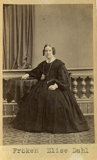 Text på kortets baksida: "Språklärarinnan Fröken Elise Dahl, Uddevalla. Död 1 maj 1867. 47-8-8. Maria Elisabeth Dahl".