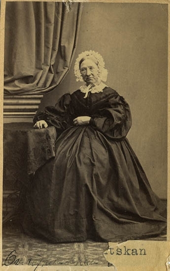 Text på kortets baksida: "Fru Johanna Selina Eding, f Strandberg. Född 1801 död 1890. g.m. Överstelöjtnant C.F. Eding".