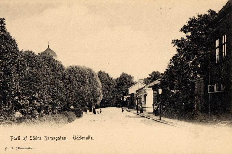 Tryckt på kortet: "Parti av Södra Hamngatan. Uddevalla."