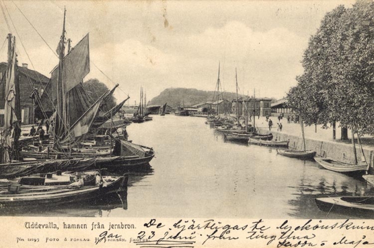 Tryckt på kortet: "Uddevalla, hamnen från Jernbron."