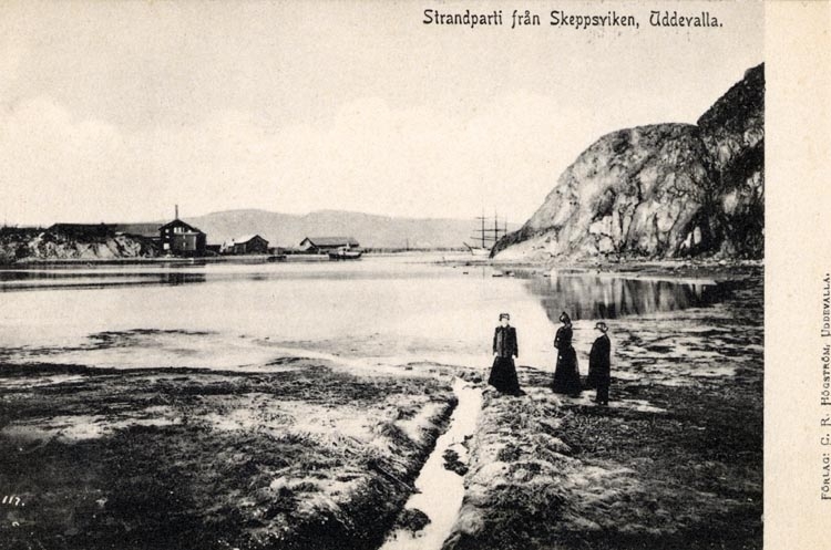 Tryckt på kortet: "Strandparti från Skeppsviken, Uddevalla."