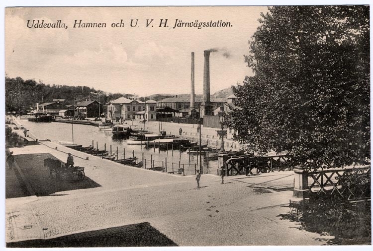 Tryckt på kortet: "Uddevalla, Hamnen U.V.H.J Järnvägsstation."