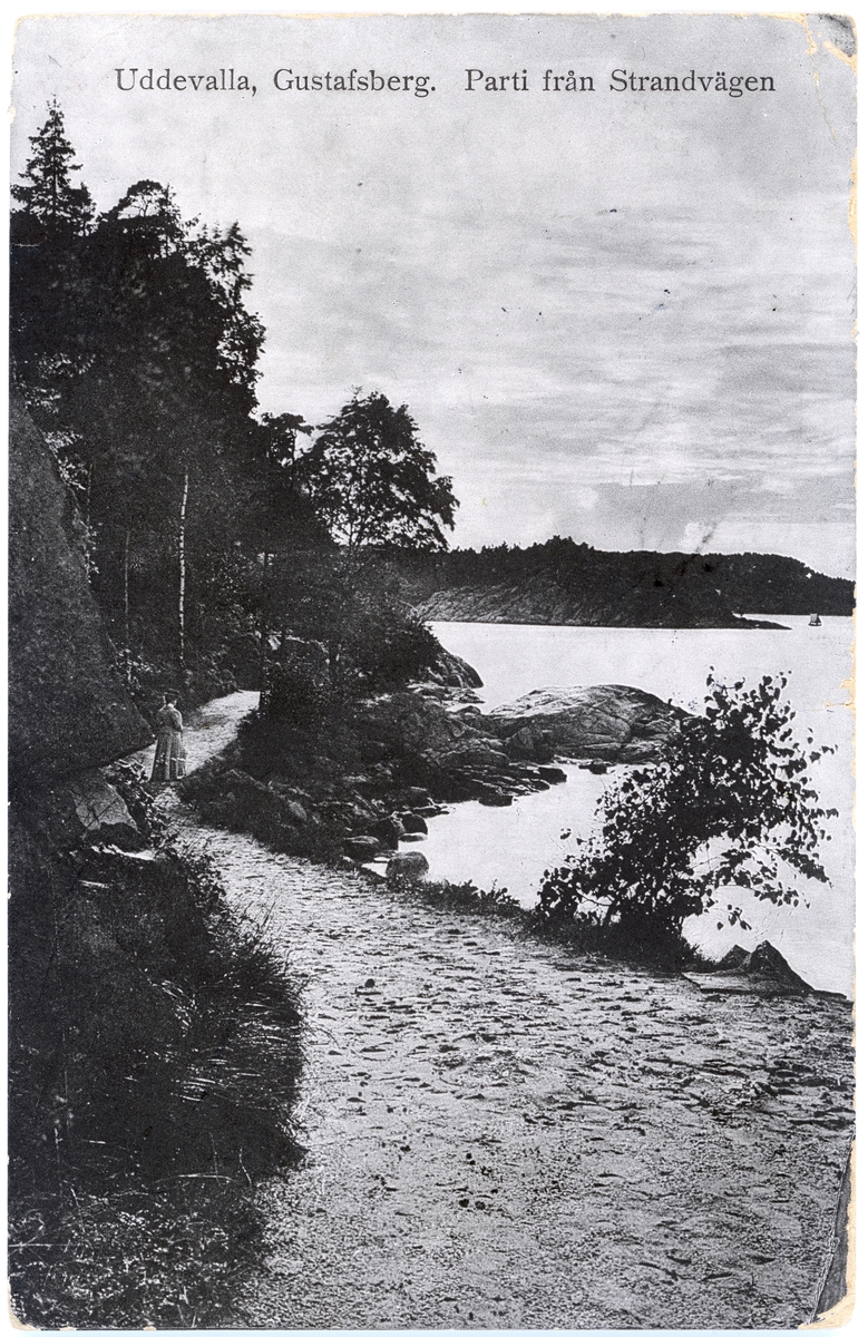 Tryckt text på vykortets framsida: "Uddevalla, Gustafsberg. Parti från Strandvägen."