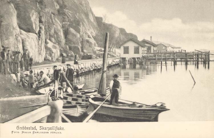 Tryckt text på kortet: "Grebbestad. Skarpsillfiske."
