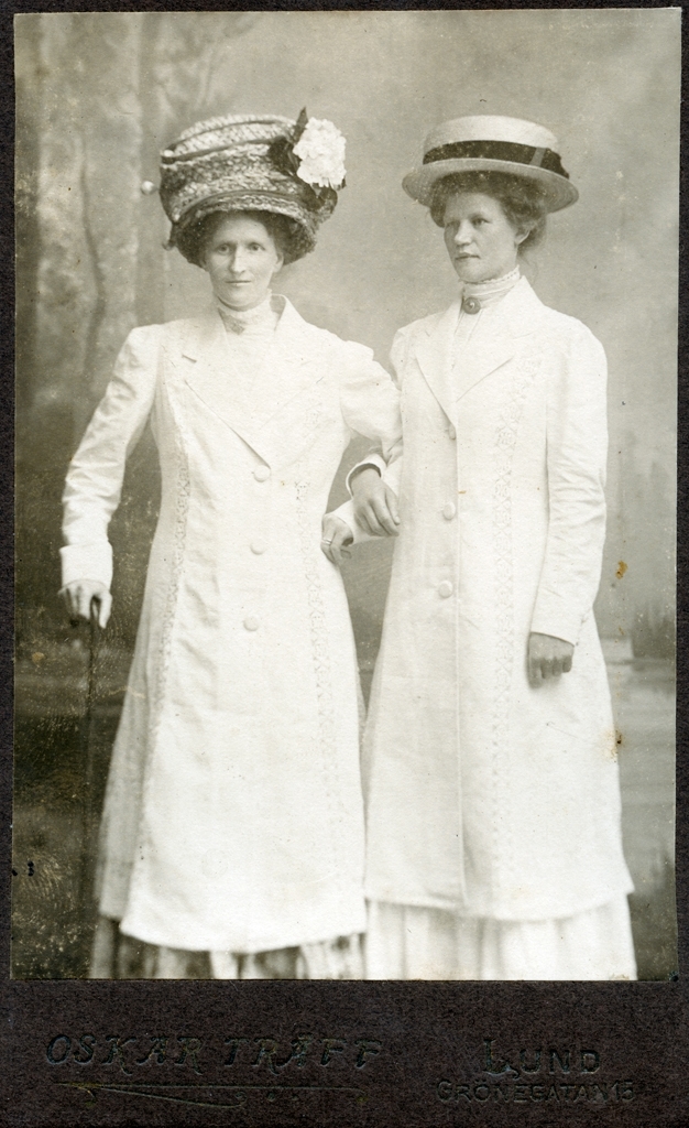 Ateljéporträtt av Mariana Träff och Emilia. De har båda stora hattar och är iklädda knälånga ljusa kappor samt långa kjolar. Mariana håller en käpp i ena handen. Kvinnorna står armkrok.