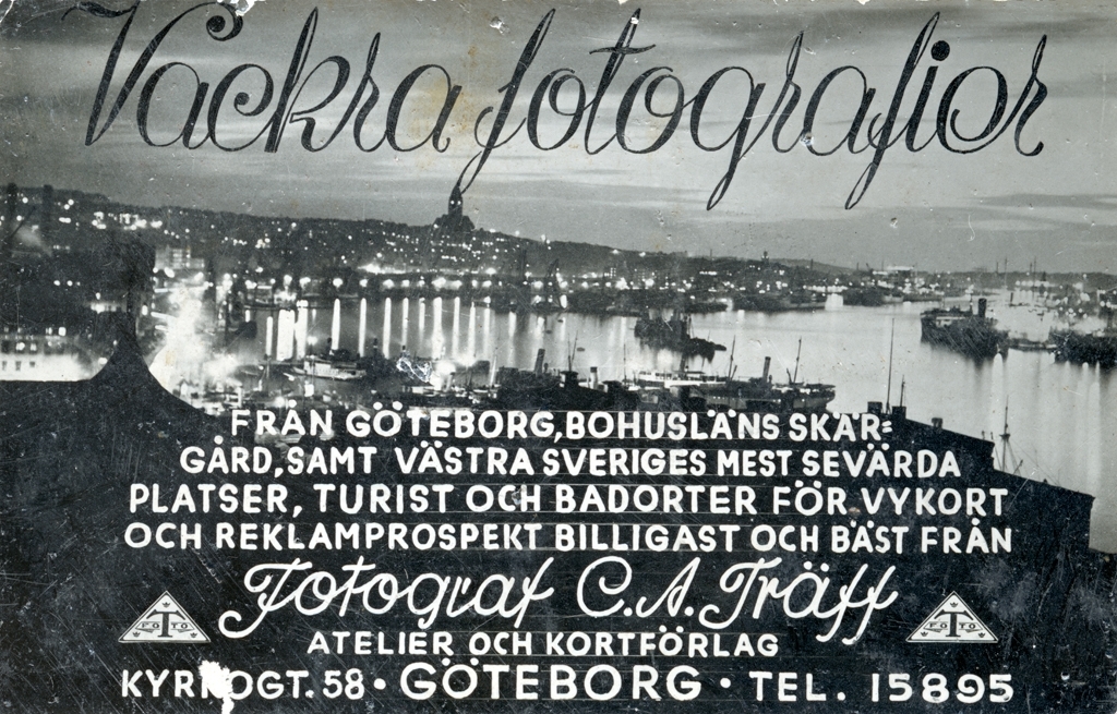 Reklam för Carl Alfred Träffs fotografiska verksamhet i form av ett vykort.