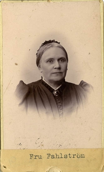 Text på kortets baksida: "Fru Carina Fahlström, född Tollstorp. Enka efter Apotekaren Adolf Fredrik Fahlström".